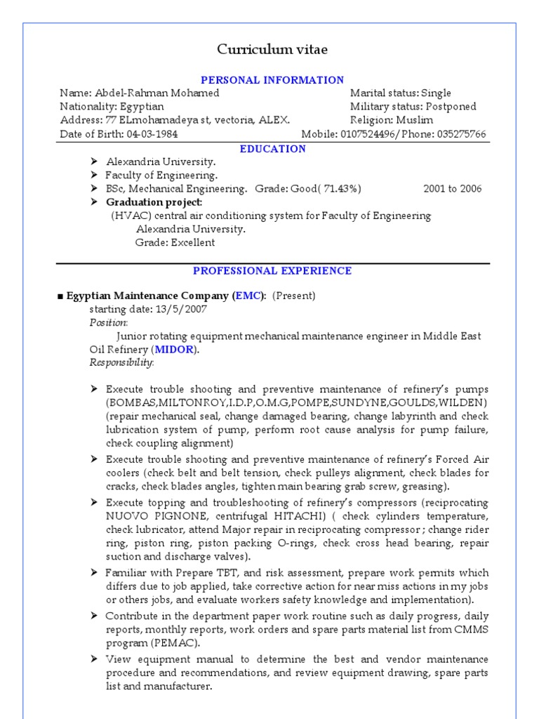 If you arent sure what information is best to include in your cv or how to format it properly take a look at our mechanical maintenance engineer cv example. Use this sample resume as a guide for writing your resume.